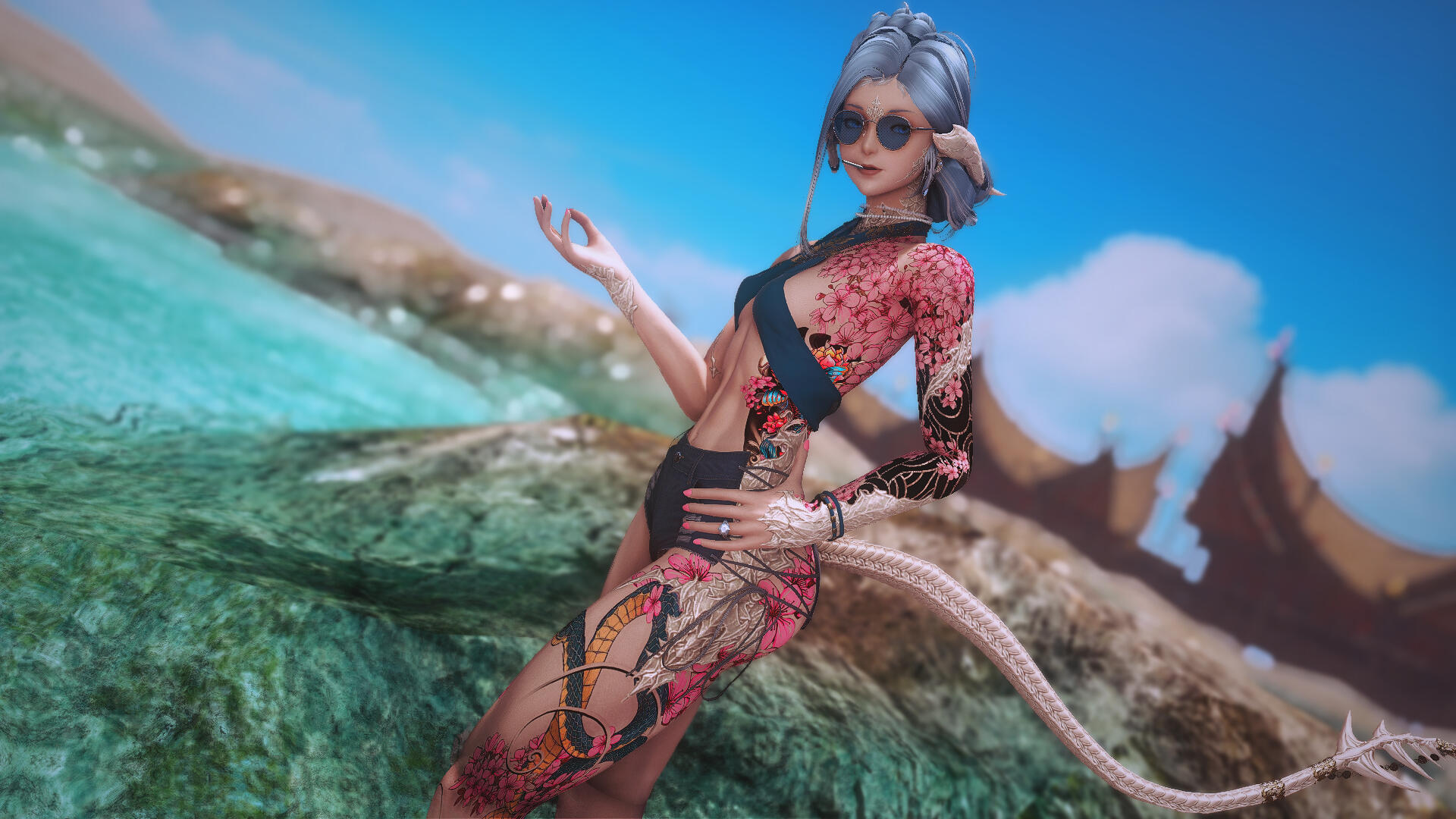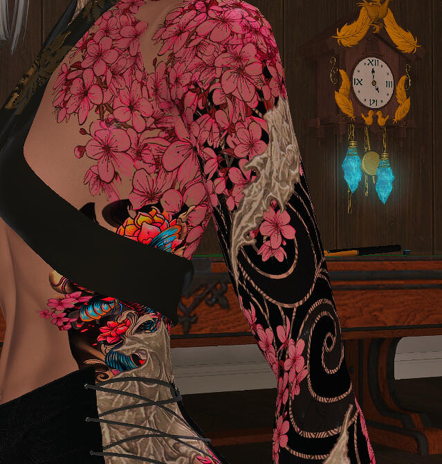 Hinami is blessed with natural ocean blue hair that is typically tied up into a bun at the back. It's extremely elegant, as if someone else dresses it for her every morning without fail. Otherwise when down her hair is long and flowing, wavy like the ocean itself.Despite her reserved demeanor she is clearly fine with showing a lot of skin on certain outfits of hers, and her body is incredibly toned to boot, with visible abs and defined muscles all over to compliment her lithe form and very modest chest that give her an overall 'sporty' look.Hinami has striking ice blue eyes that are said to pierce the soul. She is sure to accentuate them as one of her best features with carefully applied eyeliner and shadow to make them pop. They glow with an aetherial aura in times of stress.She is adorned in a myriad of jewelry pieces. The tips of her horns are covered in decorative brass and sapphire, her horns sport gold chain with moon motifs. On her neck is an amber necklace from the jungles of Golmore and lastly, the jingle of gold chain from the tip of her tail accompanies her walk.Hinami is inked with irezumi, traditional eastern ink. On her side and arms lay an adornment of blackwork, pink sakura blossoms to symbolize the fleetingness of life and love, a koi on her ribs for strength and perseverance, and a serpent that moves down her leg to symbolize cunning and smarts.You may find quick reference images below here: